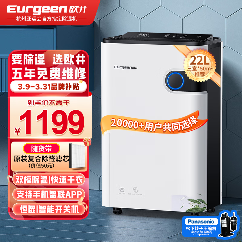 欧井(Eurgeen)京东小家智能生态 除湿机/抽湿机 除湿量22升/天 家用地下室净化杀菌智控除湿器 OJ-223E价格:1199.00元!