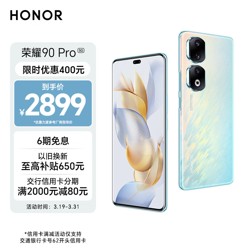 荣耀90 Pro 2亿像素写真相机 调光护眼屏 5000mAh轻薄长续航 12GB+256GB 冰羽蓝 5G价格:2899.00元!