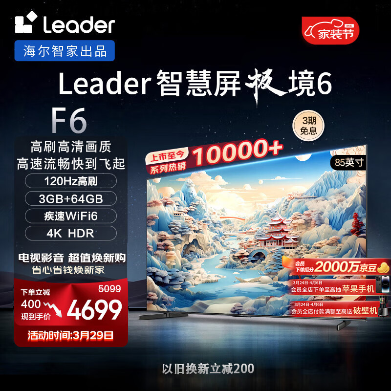Leader海尔智家出品L85F6 85英寸小超跑智慧屏120Hz高刷游戏电视双频WiFi6护眼防蓝光3GB+64GB一触投屏价格:5099.00元!