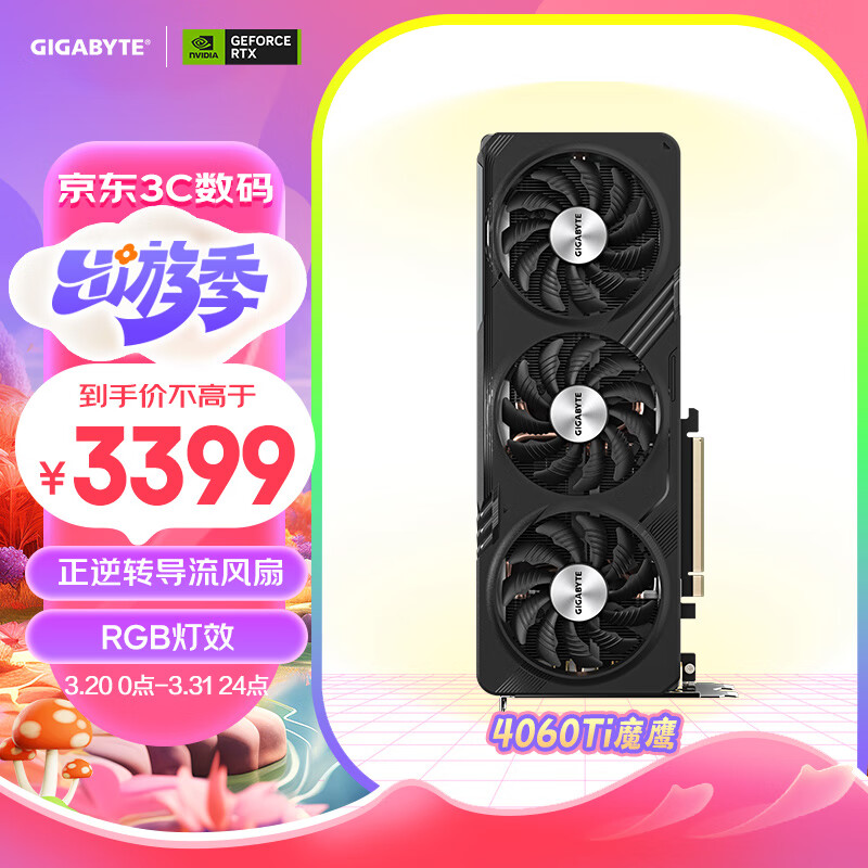 技嘉4060Ti显卡 魔鹰 GeForce RTX 4060 Ti GAMING OC 8G DLSS3 电竞游戏设计智能学习电脑独立显卡2K价格:3399.00元!