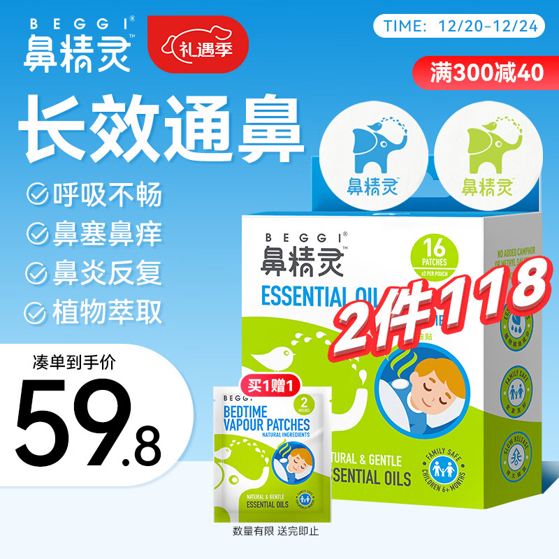BEGGI鼻精灵植物精油通鼻贴婴儿宝宝儿童鼻舒贴16贴装价格:69.00元!