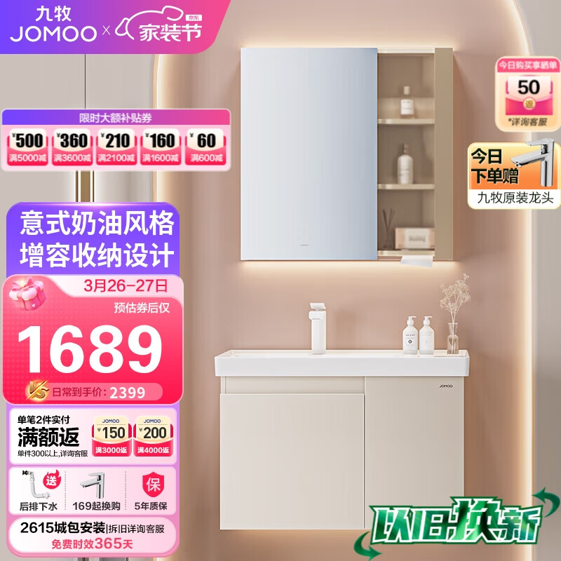 九牧(JOMOO)浴室柜 陶瓷一体盆卫生间悬挂抗菌洗脸盆柜组合80cm A2729-14BI-1价格:2179.00元!