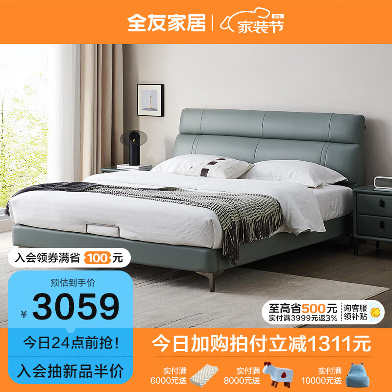 全友家居 真皮床 头层牛皮现代简约主卧室双人皮艺软包大床轻奢105251价格:4370.00元!