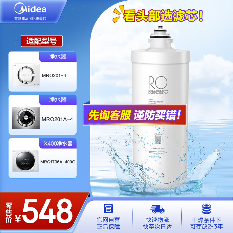 美的(Midea)净水器滤芯-适用于MRO201-4、MRO201A-4、1796A-400G MRC1698C-600G F1系列-200G RO反渗透滤芯价格:548.00元!