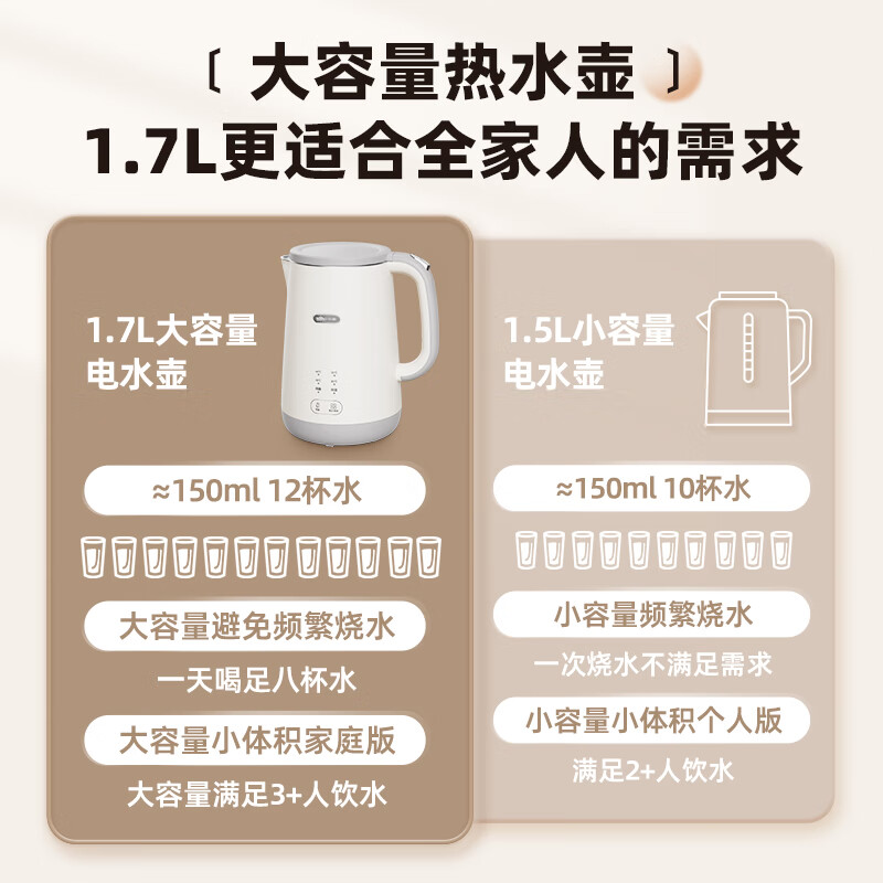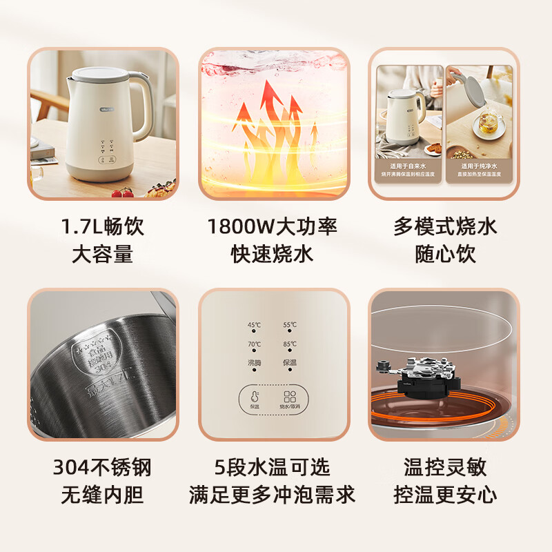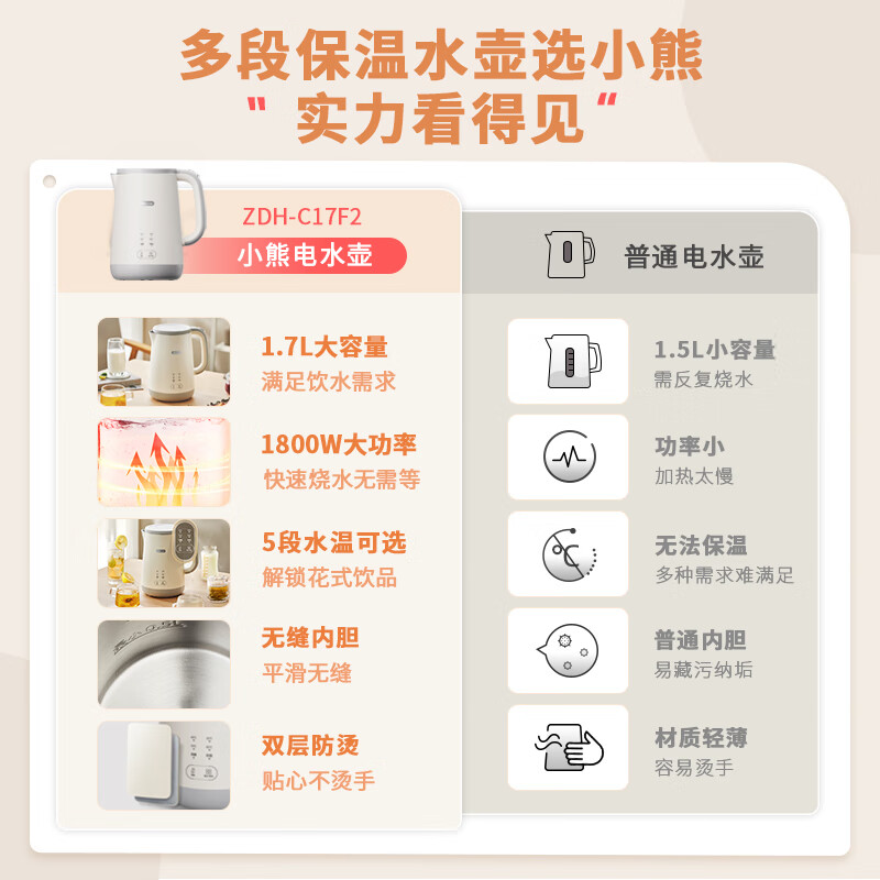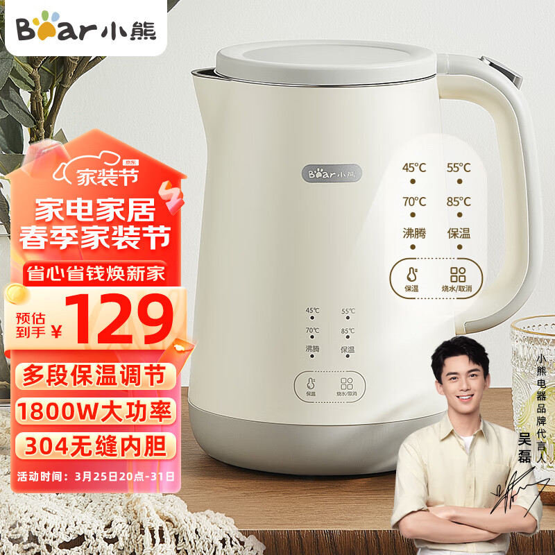小熊(Bear)烧水壶 1.7L电热水壶智能触控 5段调温恒温水壶侧显温度电水壶热水壶 无缝内胆易清洁 ZDH-C17F2价格:129.00元!
