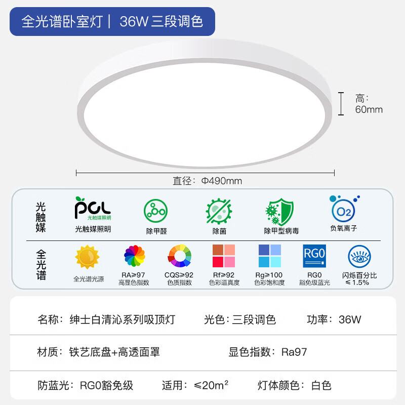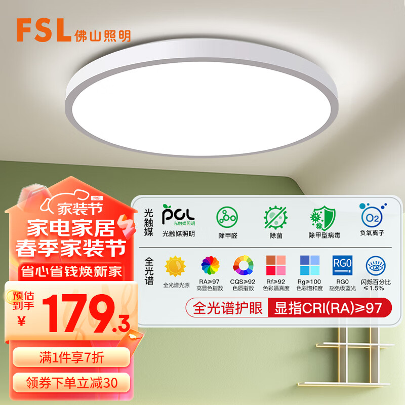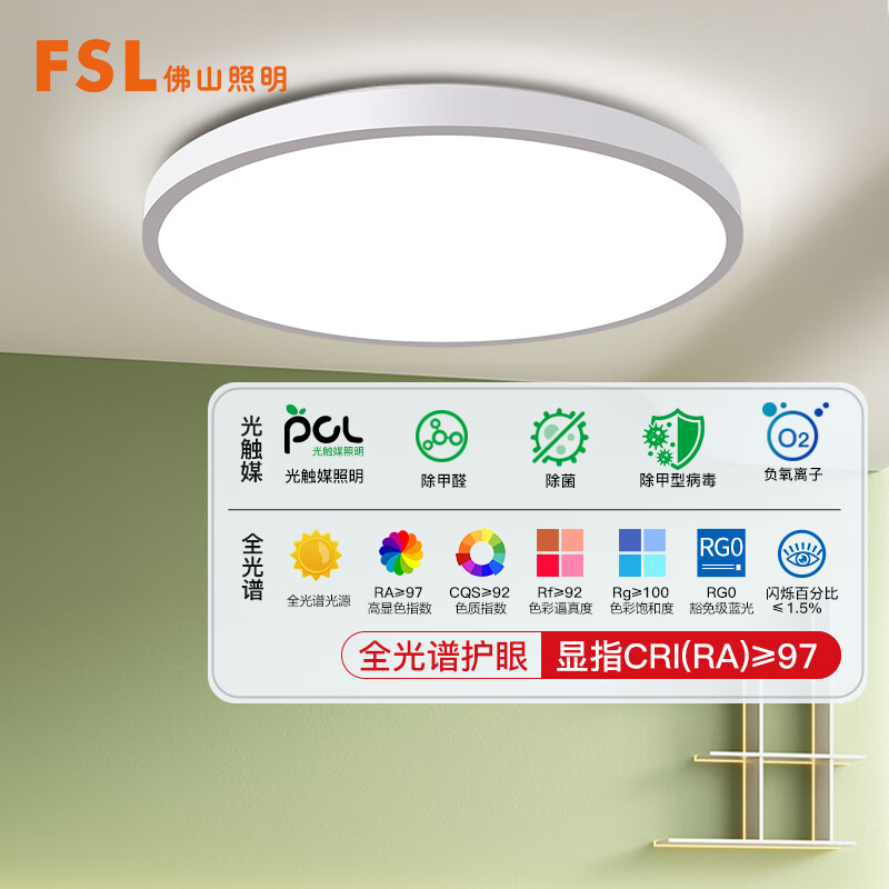 FSL佛山照明全光谱护眼吸顶灯光触媒卧室灯豁免级蓝光Ra97绅士白36W价格:299.00元!