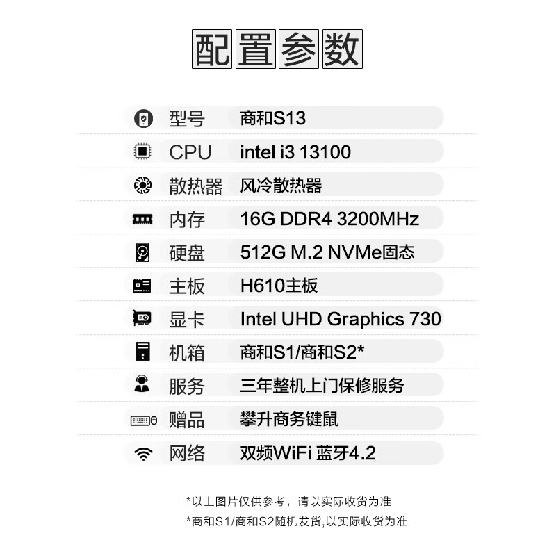 攀升商和S2 办公商用台式电脑全套整机(13代i3-13100 16G 512G WiFi 键鼠 3年上门)单主机diy组装机价格:2299.00元!