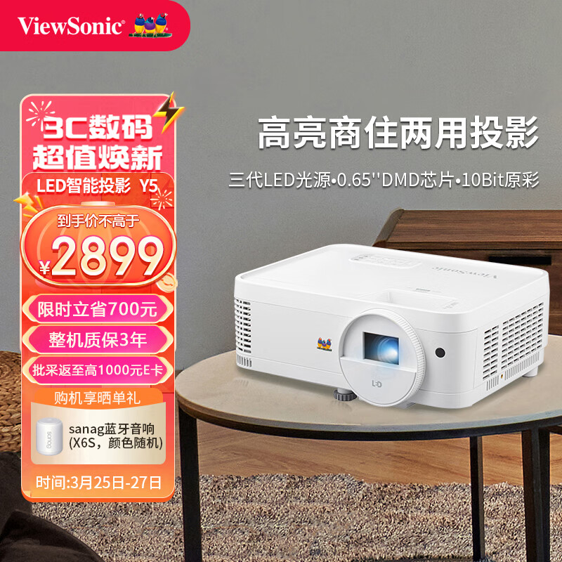 优派 Y5 投影仪办公 智能投影机 家用电竞(0.65DMD 120Hz高刷 U盘直读 无线同屏 蓝牙音响 四向校正)价格:3599.00元!