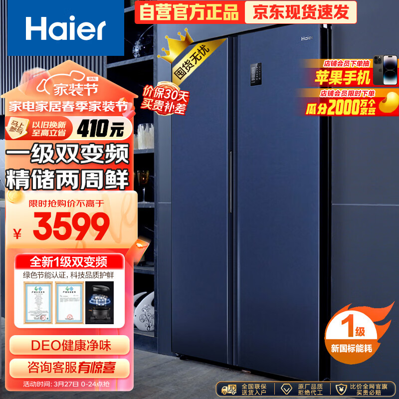海尔(Haier)538升风冷无霜对开双开门超薄家用电冰箱双变频一级能效嵌入式超大容量BCD-538WGHSSEDBL价格:3599.00元!