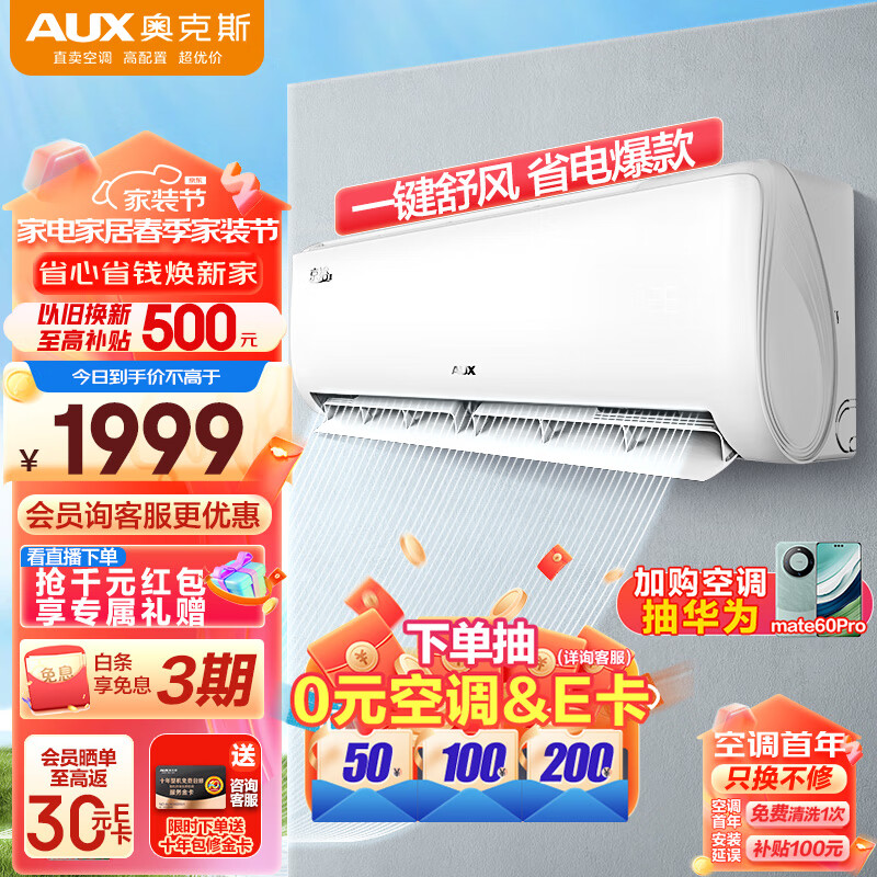 奥克斯(AUX)大1匹 新1级能效 易拆银离子滤网 变频冷暖 京裕Ⅱ空调挂机(KFR-26GW/BpR3AQE1(B1)) 独立除湿价格:1969.00元!