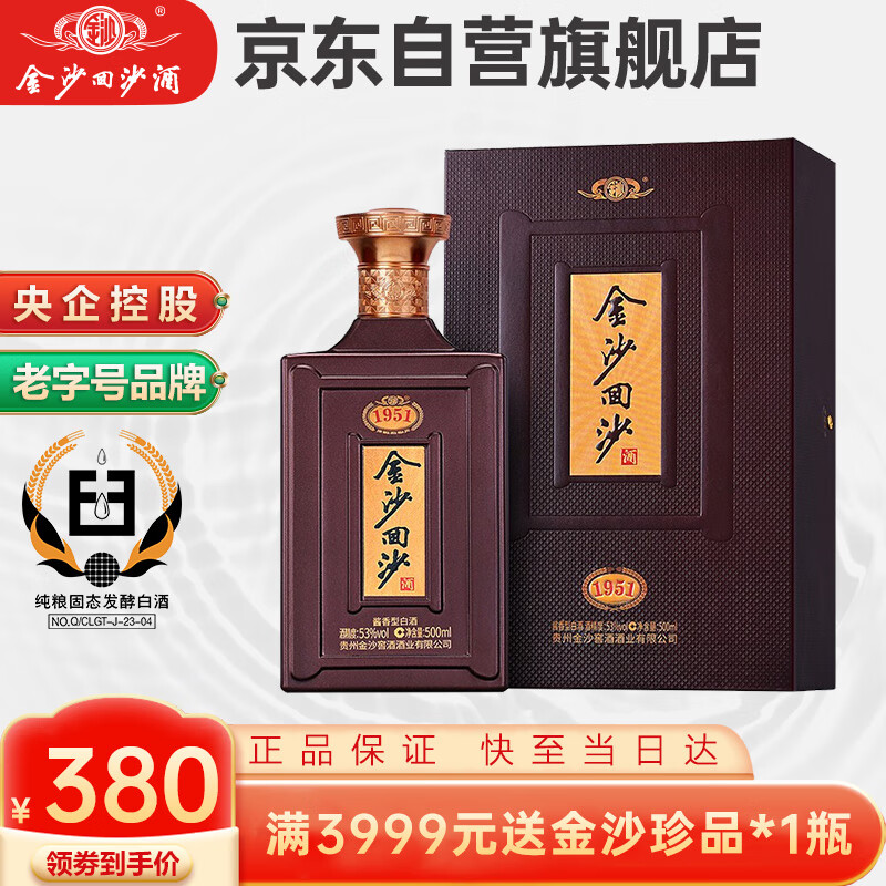 金沙回沙酒 纪年酒1951 酱香型白酒 53度 500ml 单瓶装 纯粮食酱酒价格:410.00元!