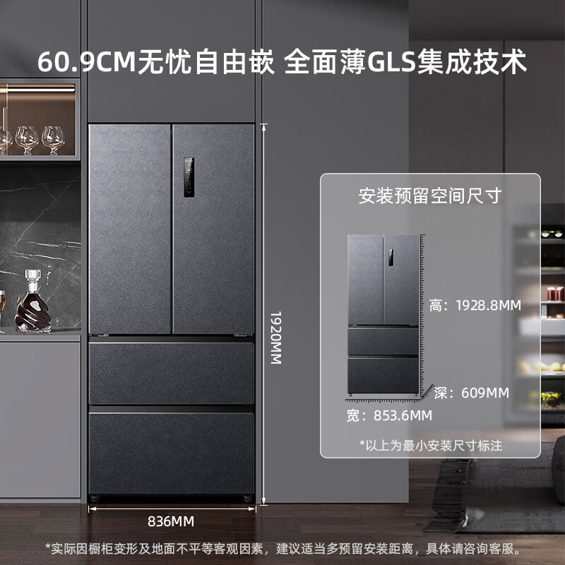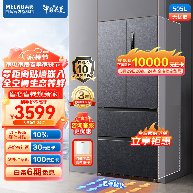 美菱(MeiLing)【无忧嵌】505升法式多门家用变频一级能效大容量风冷无霜净味冰箱超薄零嵌入式BCD-505WPU9CX灰价格:3599.00元!
