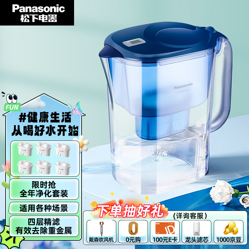 松下(Panasonic)过滤净水器家用滤水壶净水壶(1壶6芯套装)自来水过滤器3.5L滤水壶 蓝色升级款价格:259.00元!