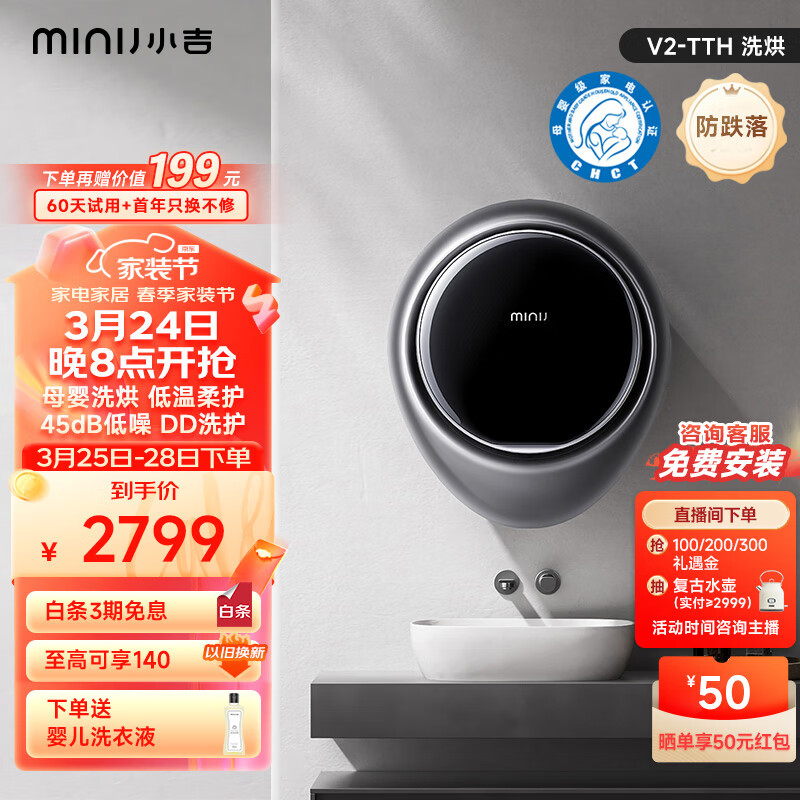 小吉(MINIJ)智控壁挂洗烘一体洗衣机 迷你母婴洗衣机 APP操控全自动滚筒除菌烘干机V2-TTH价格:2799.00元!