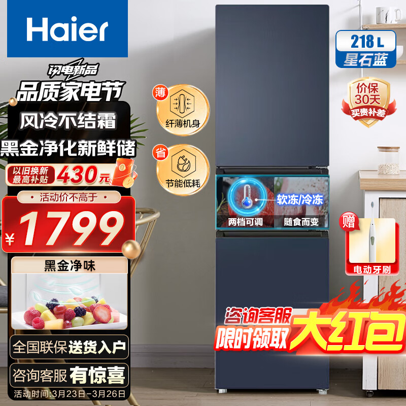 海尔(Haier)218升冰箱 三门超薄小型迷你家用风冷无霜冰箱 黑金净化 独立中门变温 节能低噪 租房公寓电冰箱价格:1799.00元!