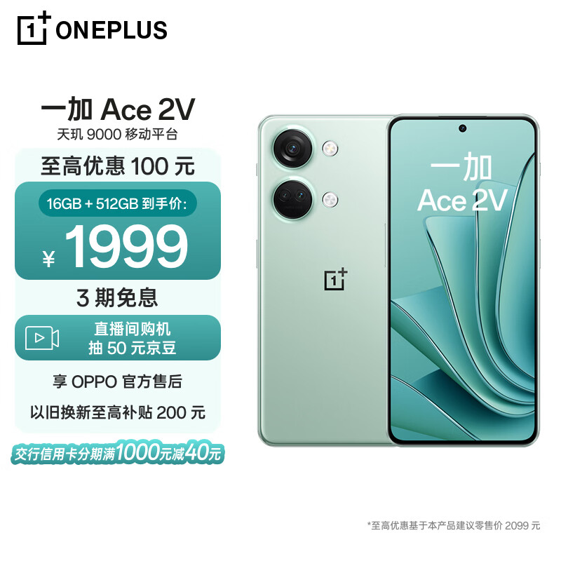 一加 Ace 2V 16GB+512GB 青釉 天玑 9000 移动平台 1.5K 灵犀触控直屏 OPPO 拍照 5G学生游戏电竞手机价格:2099.00元!