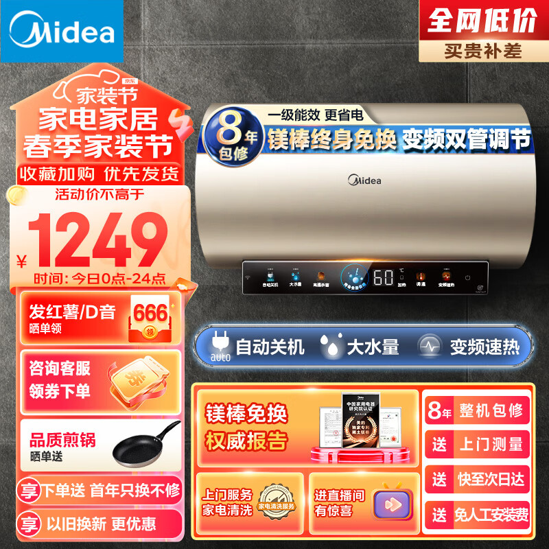 美的(Midea)终身免换镁棒60升电热水器家用储水式3300W/2300W速热变频省电一级能效低耗节能F6033-JE6(HE)价格:1449.00元!