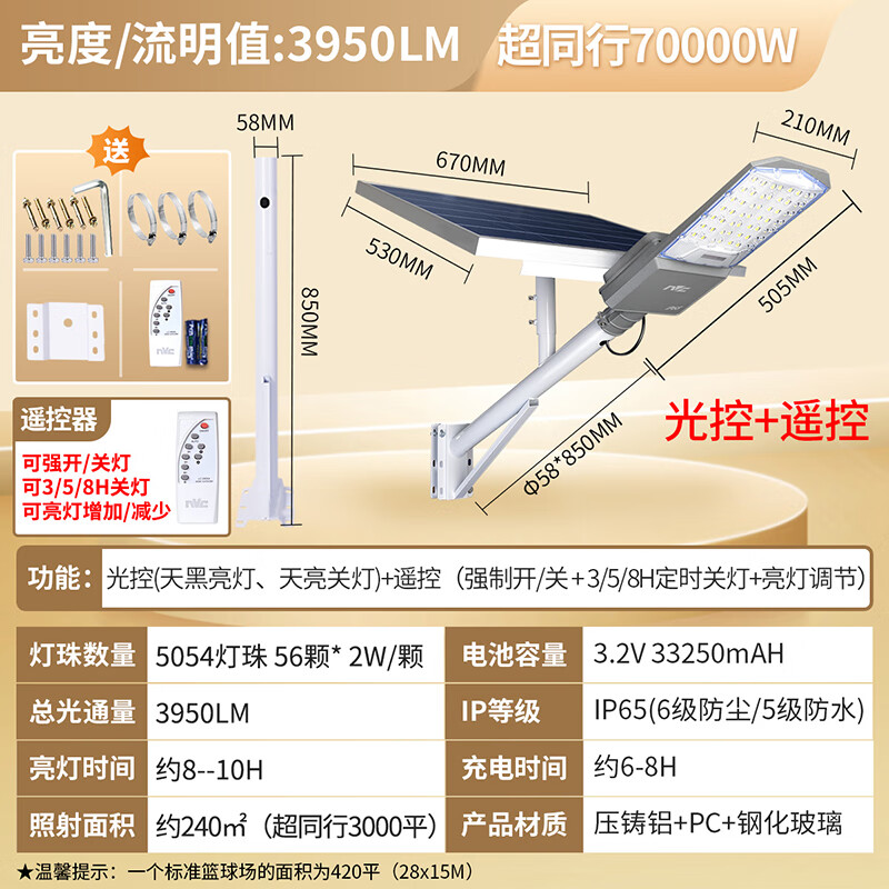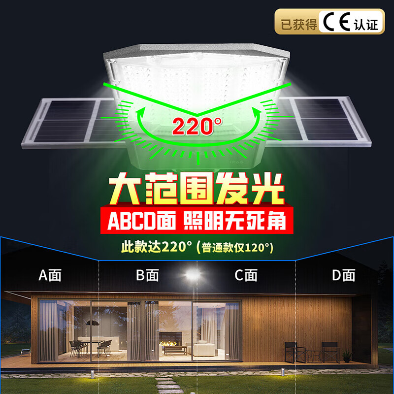 雷士(NVC)太阳能路灯户外灯光控高亮照明投光灯庭院灯遥控3950lm+照约240㎡价格:899.00元!
