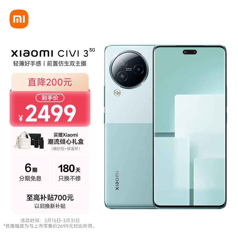 小米 Civi 3 前置仿生双主摄 光学防抖镜头 12GB+512GB 薄荷绿 5g手机 澎湃OS SU7 汽车互联价格:2499.00元!