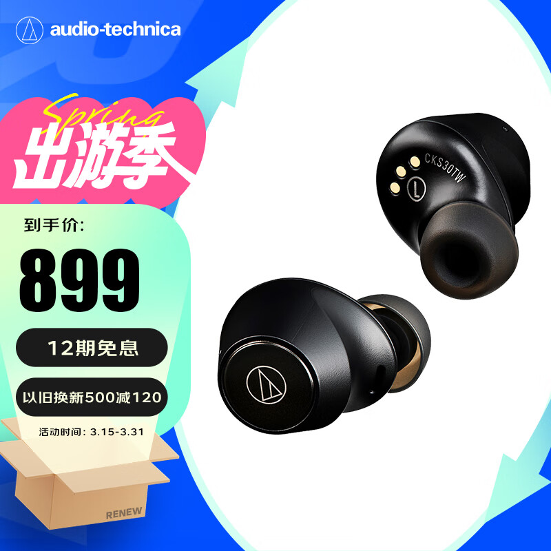 铁三角(Audio-technica)CKS30TW 真无线蓝牙5.1耳机 入耳式音乐重低音防水 兼容苹果华为小米手机 黑色价格:899.00元!