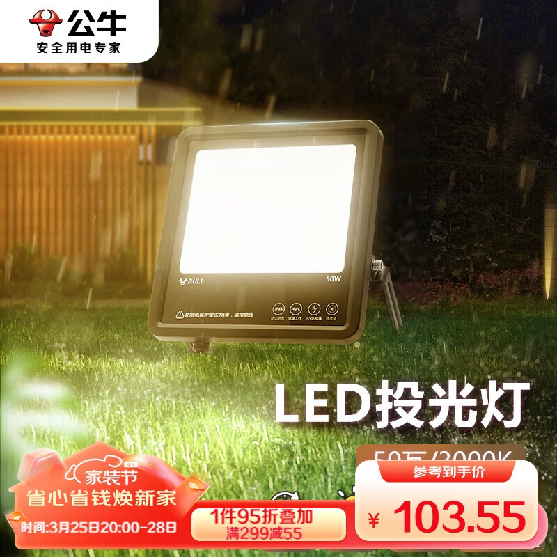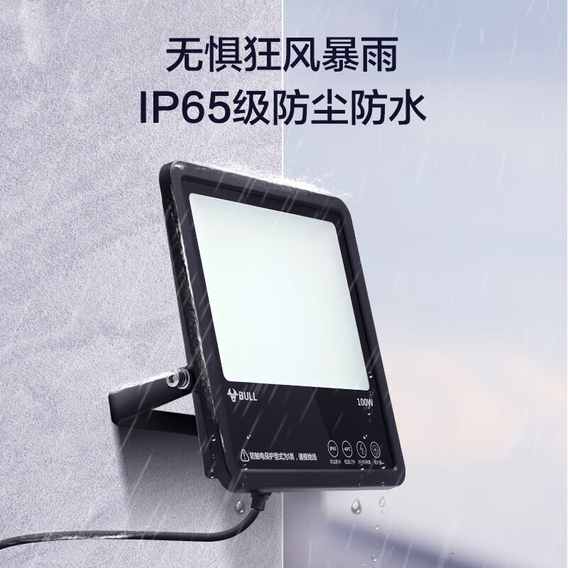公牛(BULL)LED投光灯户外路灯庭院灯工地灯露营灯 IP65防水50W-3000K暖白光价格:109.00元!