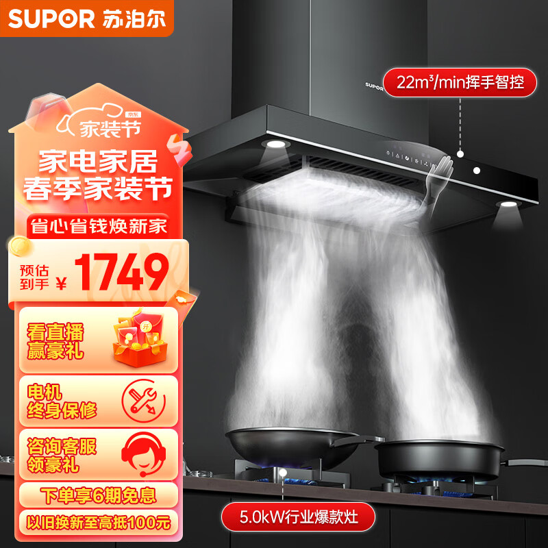 苏泊尔(SUPOR) 抽油烟机 烟灶套装22立方家用欧式吸油烟机燃气灶具套装挥手智控 自清洁 DT32+Q5液价格:1849.00元!