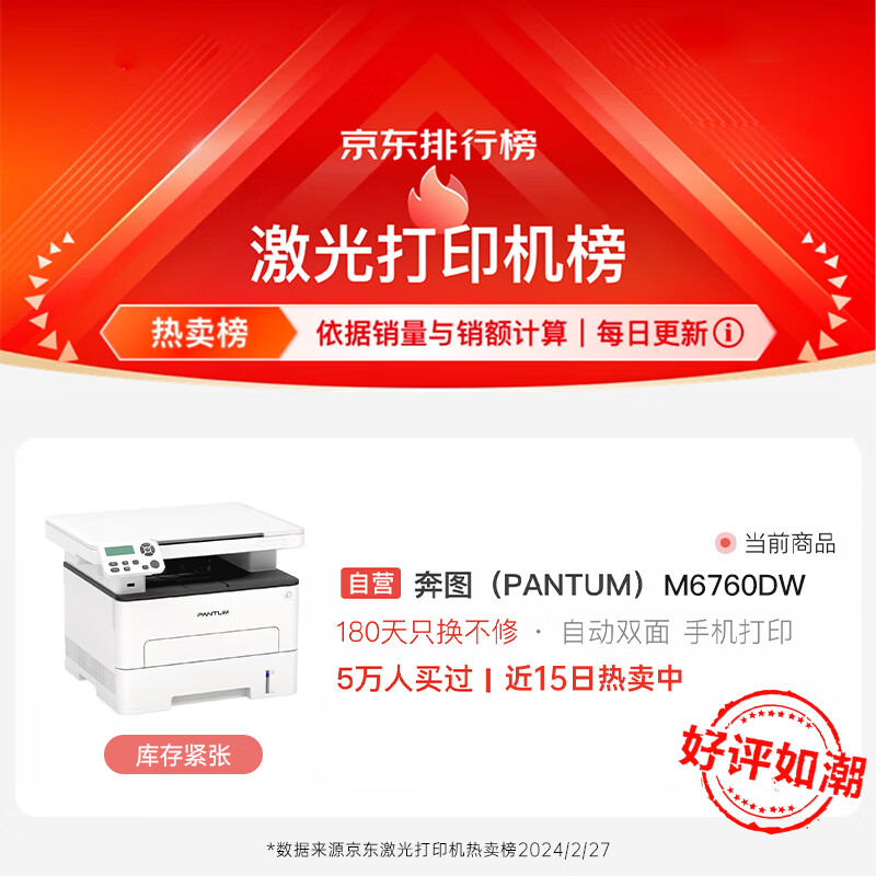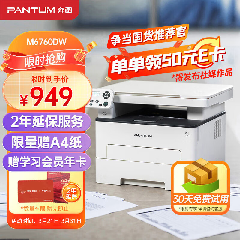 奔图(PANTUM)M6760DW激光打印机家用 自动双面打印机无线办公作业 手机连接 家庭打印复印扫描一体机价格:949.00元!