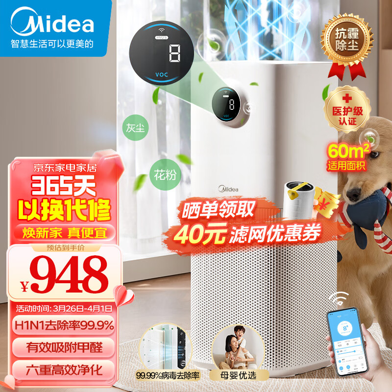 美的(Midea)【医护级】空气净化器“森林Air3S”除甲醛除烟味除猫毛99.99%除菌六重净化空气消毒机KJ500G-L1价格:1299.00元!