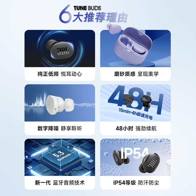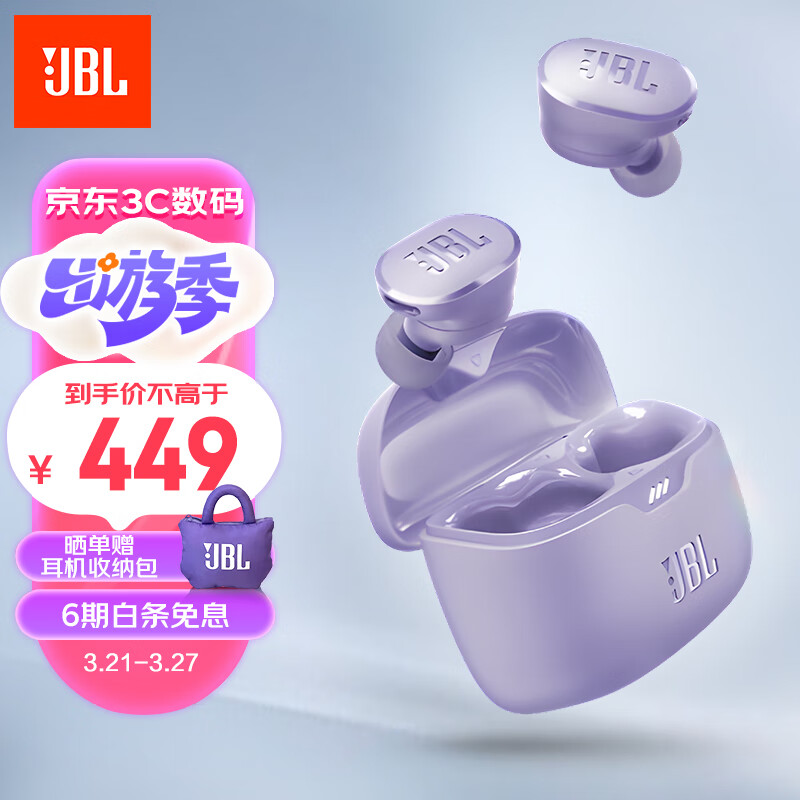JBL TUNE BUDS琉璃豆真无线蓝牙耳机 主动降噪运动耳机 苹果华为小米带麦游戏耳机 磨砂紫价格:449.00元!