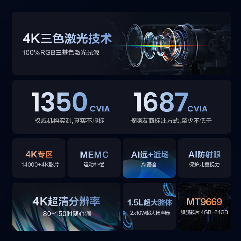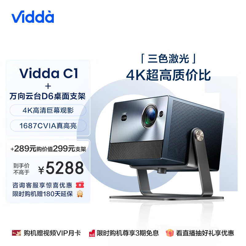 Vidda C1 海信三色激光投影仪 4K超高清投影仪家用投影机 卧室投墙可投天花板(含投影仪万向云台支架D6)价格:5288.00元!