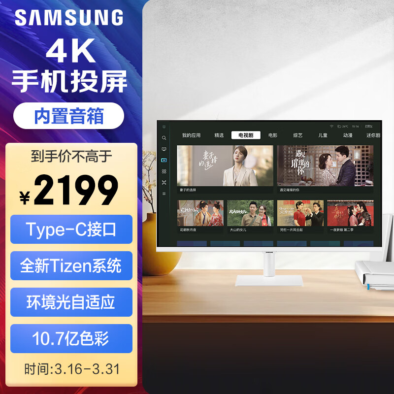三星(SAMSUNG)32英寸 4K Type-C 65w 海量app 蓝牙连接 Tizen系统 内置音箱 M70C 办公 智慧显示器 S32CM703价格:2599.00元!