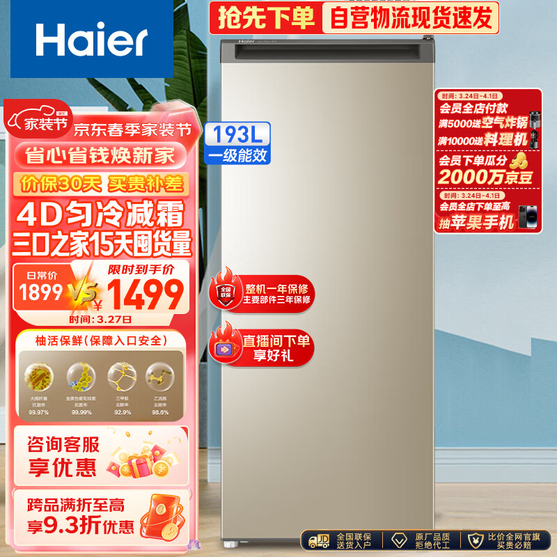 海尔(Haier)193升匀冷家用立式冰柜 母乳冷冻柜抽屉式冷柜囤货小冰柜家用小型冰箱BD-193MDT价格:1499.00元!