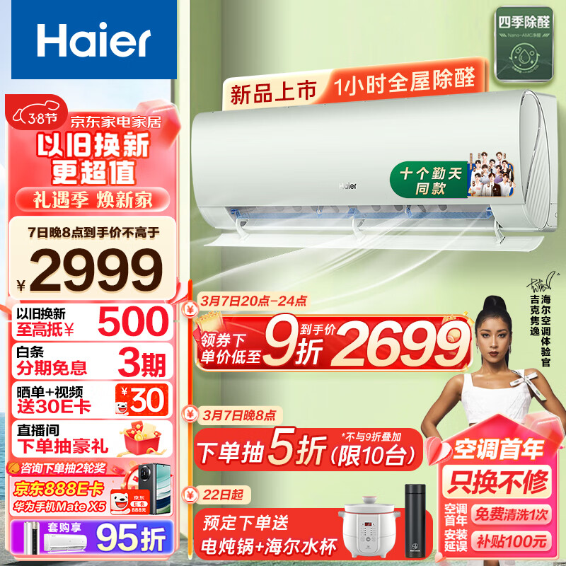 海尔(Haier)劲爽除醛版 1.5匹新一级能效变频节能 冷暖壁挂式空调挂机 KFR-35GW/C2LGA81U1 以旧换新价格:2999.00元!