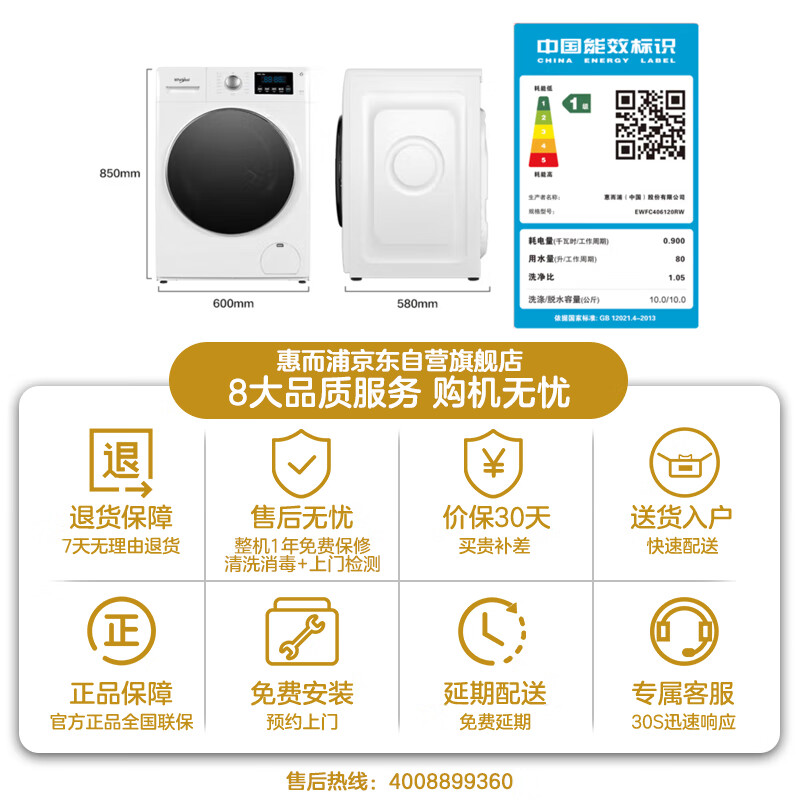 真的要说惠而浦EWFC406120RW,使用感受还不错的,洗衣机收到了,这是买的第二台惠而浦洗衣机了,好看大气,洗的干净,物流也很好!