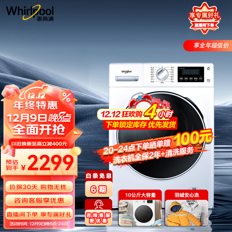 惠而浦(Whirlpool)滚筒洗衣机全自动 10公斤大容量 内衣羽绒随心洗 深层除菌螨 变频电机 一级能效省电 EWFC406120RW价格:2499.00元!