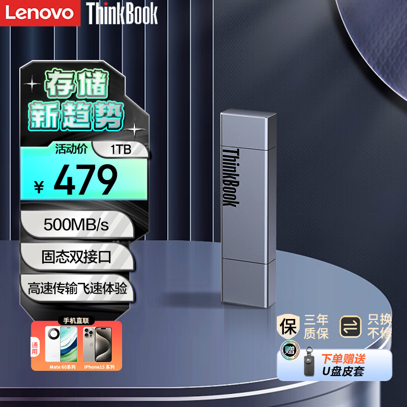ThinkPad联想 1TB Type-C USB3.0 双接口固态U盘 500MB/s高速优盘 电脑手机直连 TB30价格:499.00元!