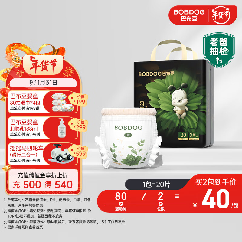 巴布豆(BOBDOG)【老爸】奇迹奢宠婴儿拉拉裤XXL码20片(14-17kg)植萃舒敏价格:79.00元!