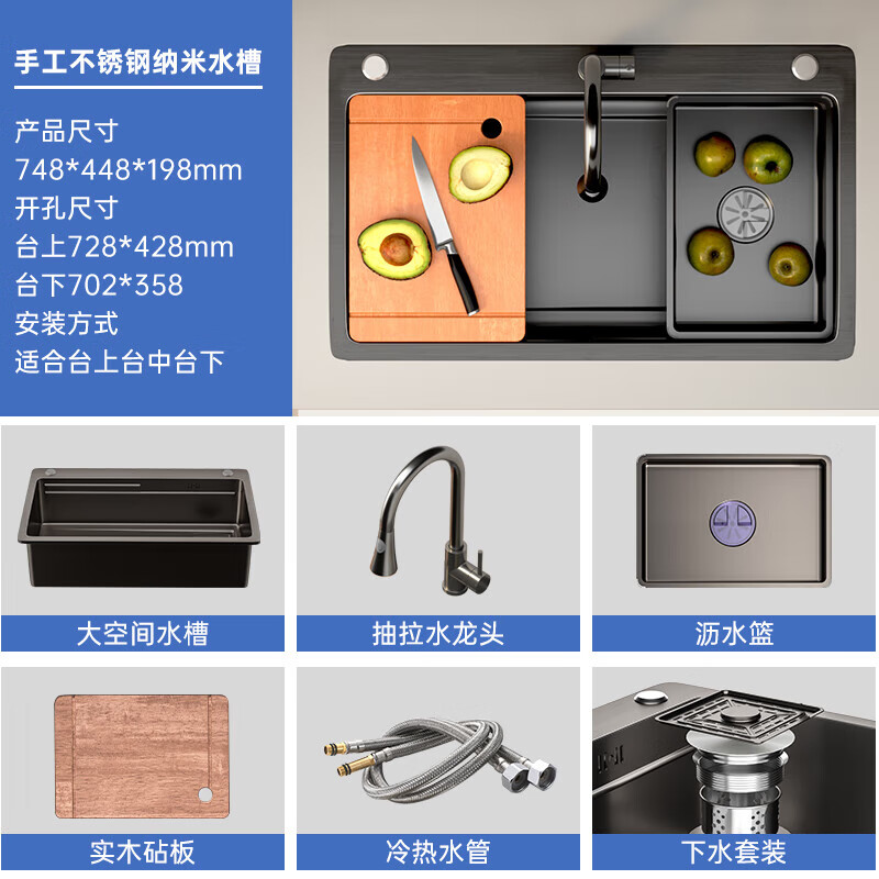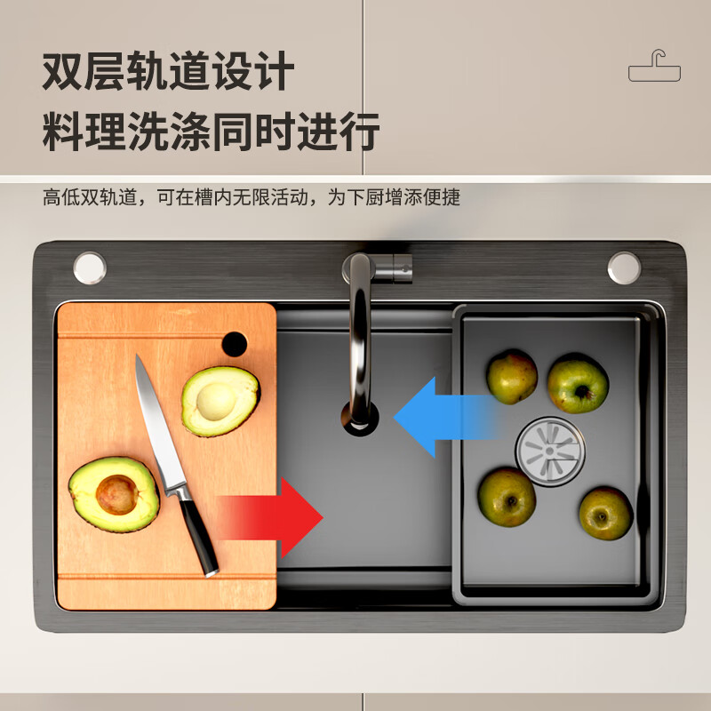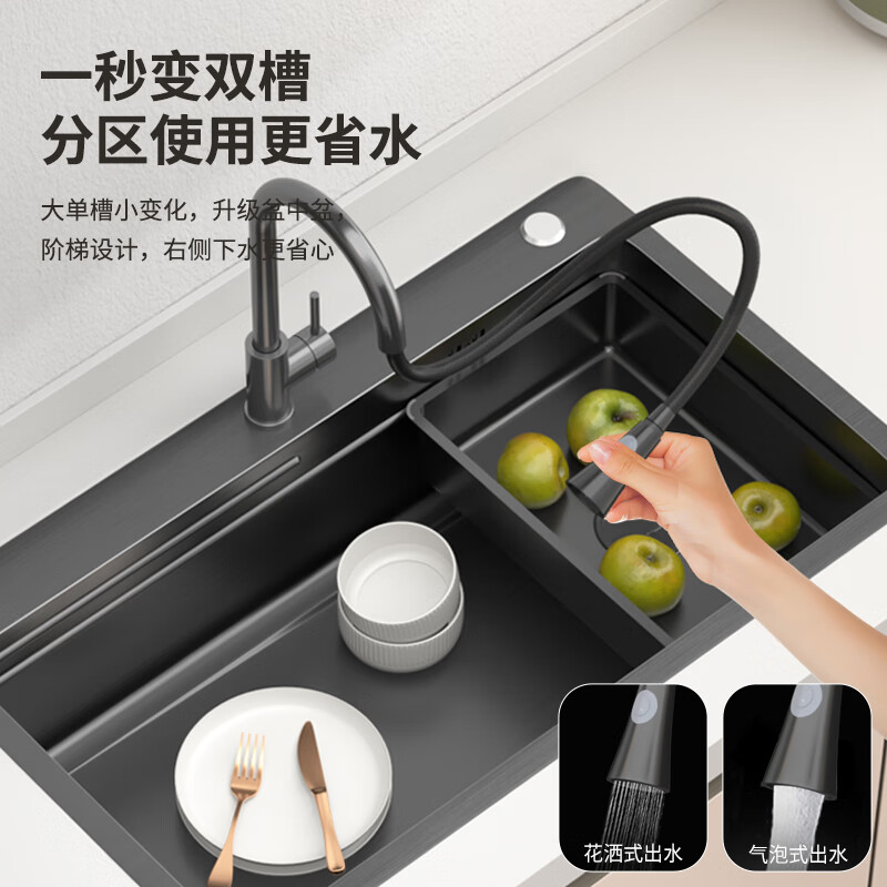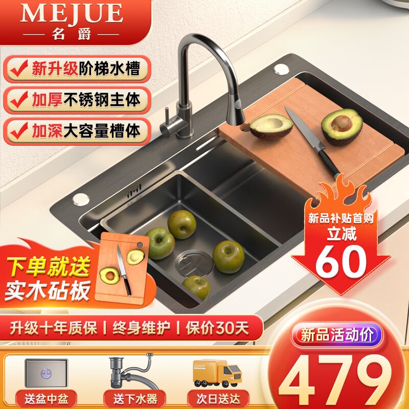 名爵(MEJUE)厨房水槽洗碗池洗菜盆黑色一体盆纳米不锈钢阶梯式水池大单槽2464价格:539.00元!