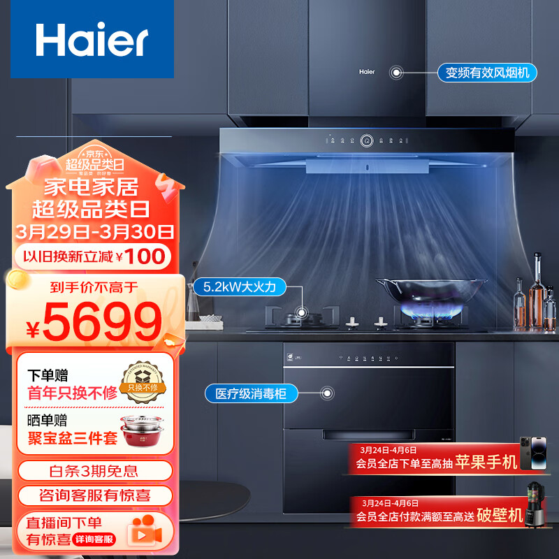 海尔(Haier) 消毒柜 油烟机 燃气灶 烟灶消三件套 115L三层大容量+变频有效风25大吸力+5.2kw超大火力价格:6333.00元!