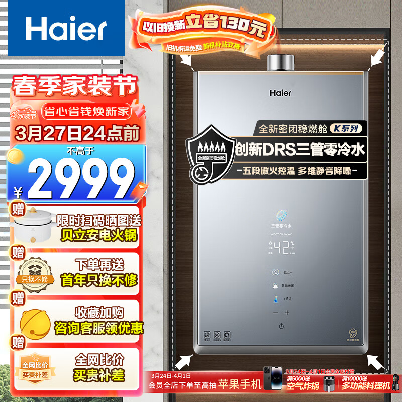海尔(Haier)16升【K系列KT3】燃气热水器天然气 DRS真三管零冷水 五段微火控温 一级静音JSQ31-16KT3FRXGU1价格:3299.00元!