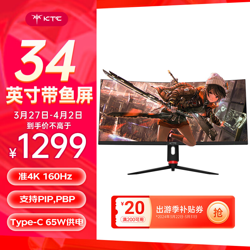 KTC 34英寸准4K超频160Hz 曲面带鱼屏 HDR400 99%sRGB 无闪屏防撕裂 升降壁挂 电竞显示器 H34S18S价格:1999.00元!