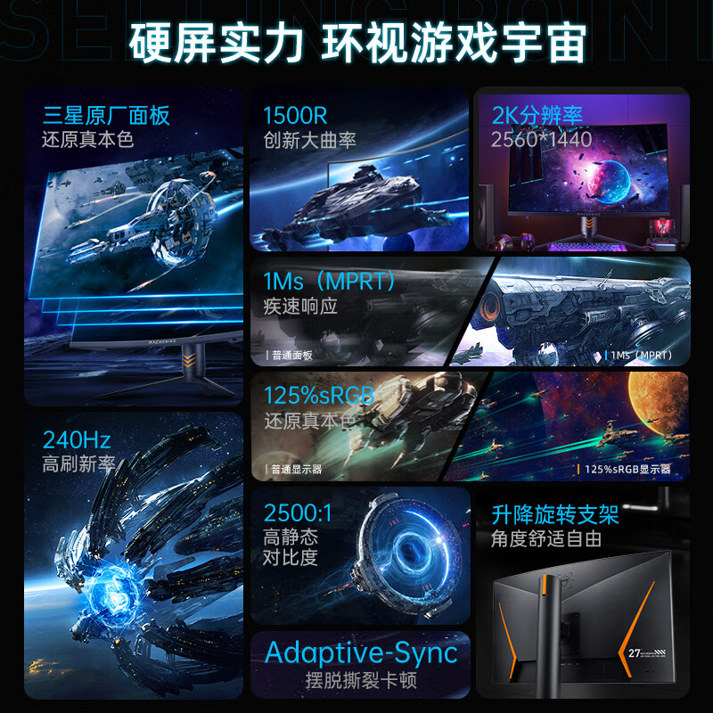 机械师 星辰pro 27英寸 2K 240Hz 1ms HDR 1500R曲面 125%sRGB电脑游戏电竞屏幕显示器升降旋转 MK27QG240A2价格:2299.00元!