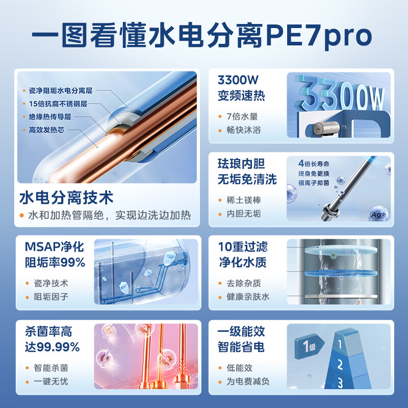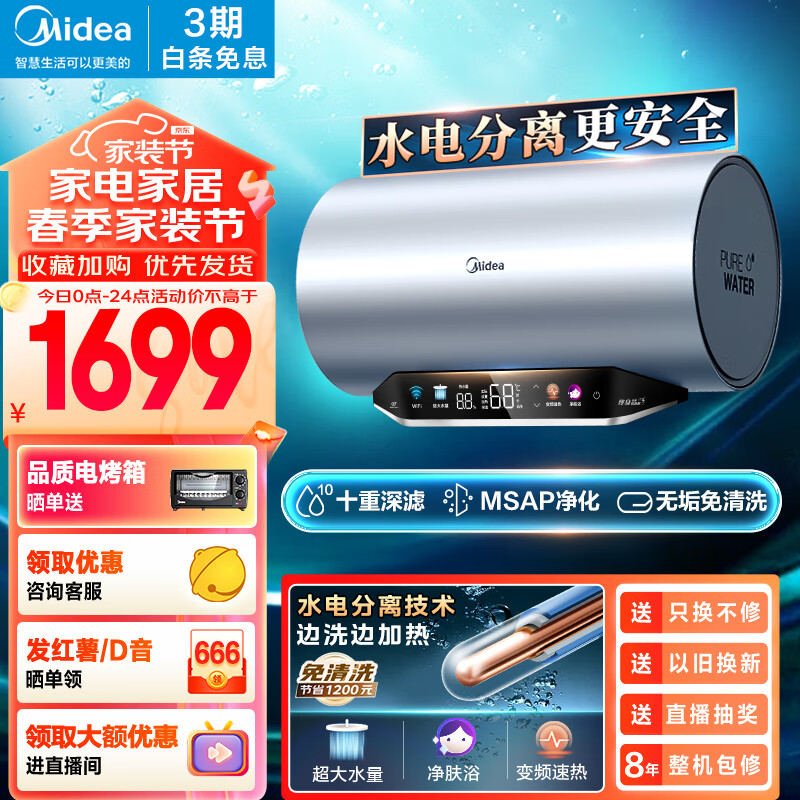 美的(Midea)水电分离60升电热水器家用 3300W变频 10重过滤净肤 瓷净舱内胆免清洗 储水式F6033-PE7pro(HE)价格:1799.00元!
