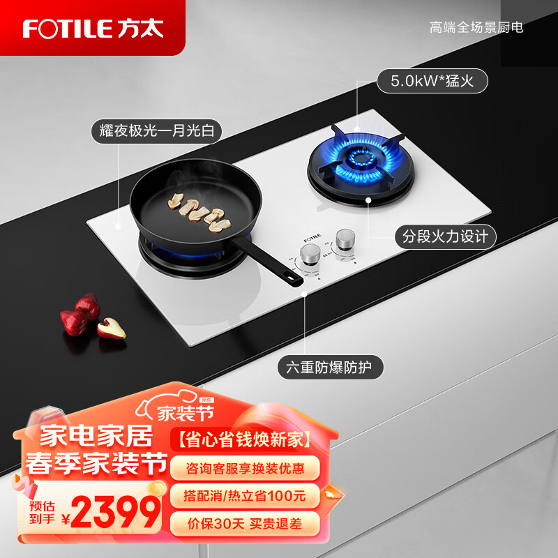 方太 燃气灶(天然气)家用嵌入式燃气灶 换装灶具 5.0kW*大火力01-THF1-W 月光白价格:2599.00元!