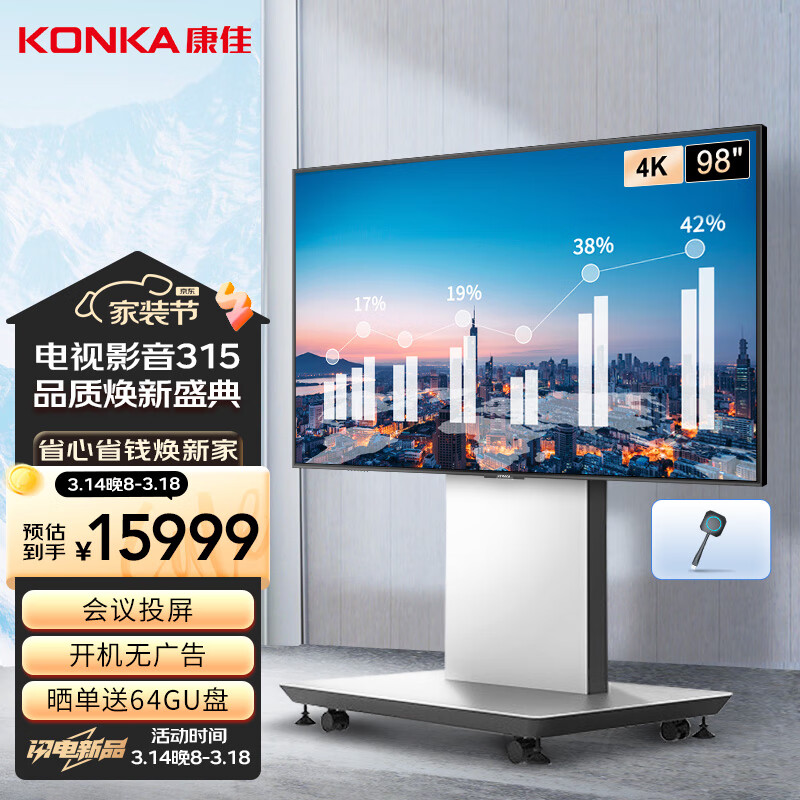 康佳(KONKA)98英寸会议电视大屏办公平板一体机 4K超高清无线投屏 商用显示智慧屏 开机直达 98X6+移动支架价格:15999.00元!