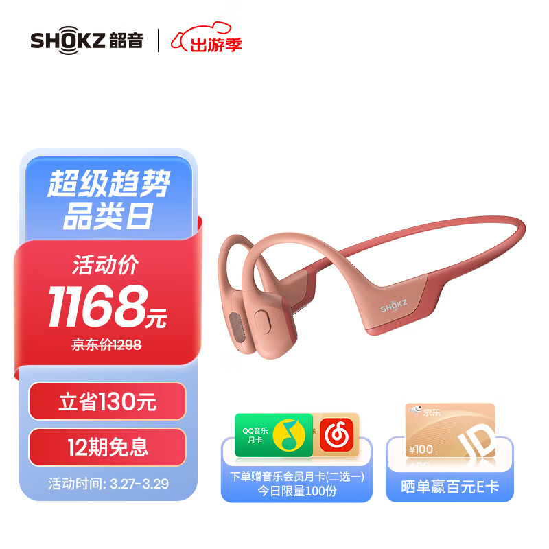 韶音(SHOKZ)OpenRun Pro骨传导蓝牙无线开放式耳机耳麦 不入耳式运动高音质 低频增强S810 西柚粉价格:1298.00元!