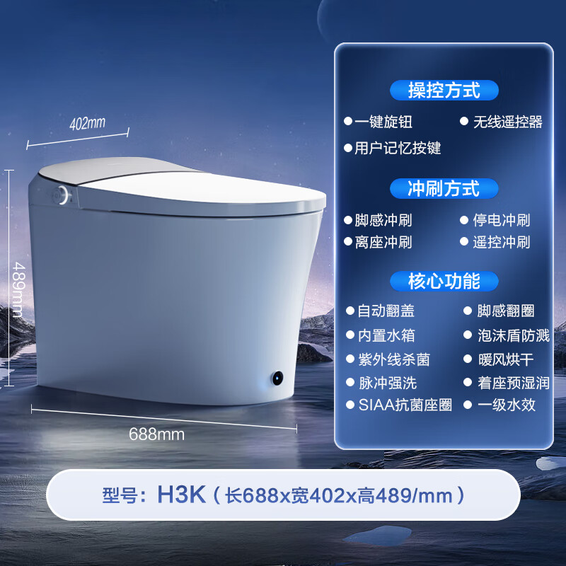 功能:暖风烘干,自动除臭,臀部清洁,座圈加热,喷嘴自洁,女性清洗,喷嘴移动清洗,净化水质,水温调节,水压调节,感应翻盖,风温调节,坐温调节,感应翻圈,柔和夜灯
