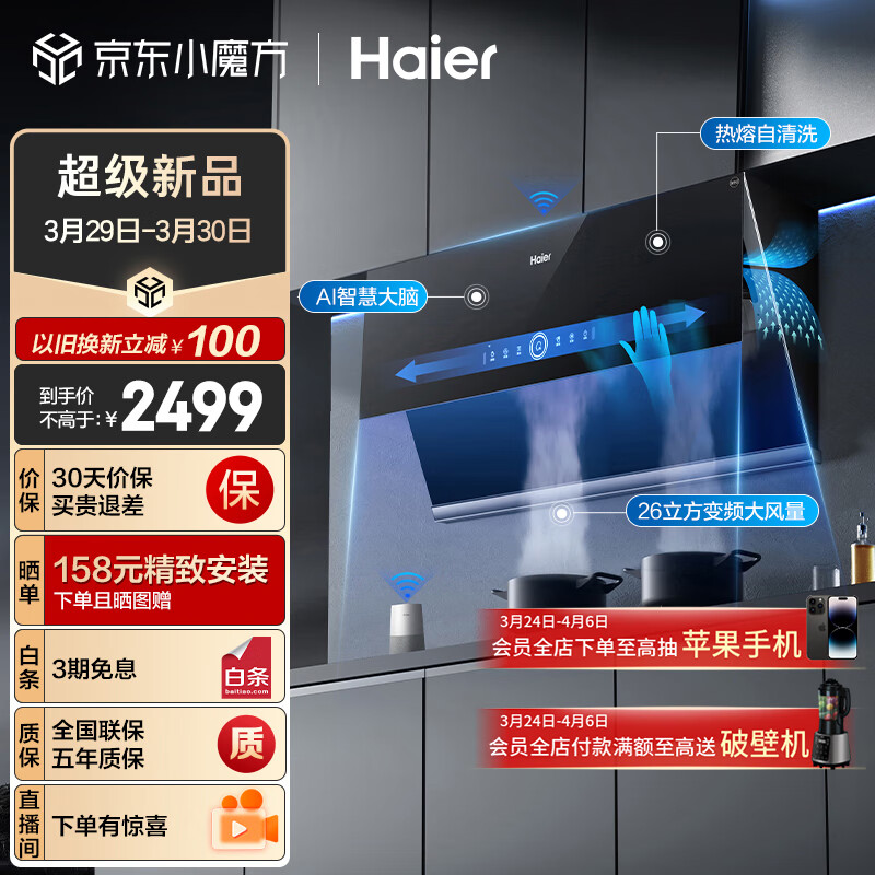 海尔(Haier)抽油烟机 侧吸式吸烟机 变频26立方大吸力 挥手智控 自动清洗 家用厨房排烟机EC911UD价格:2499.00元!
