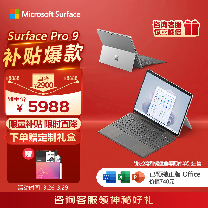 微软Surface Pro 9 二合一平板电脑 i5/8G/256G亮铂金 13英寸高刷触控?教育学习机 高端办公笔记本电脑价格:5988.00元!