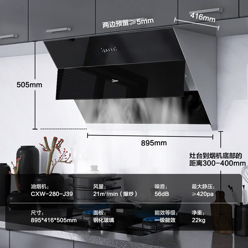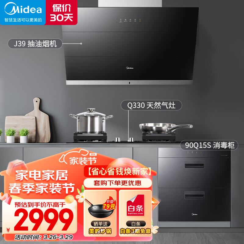美的(Midea)烟灶消三件套侧吸智能干洗抽油烟机5.0KW火力燃气灶100L消毒柜J39+Q330+90Q15S(天然气)价格:2999.00元!